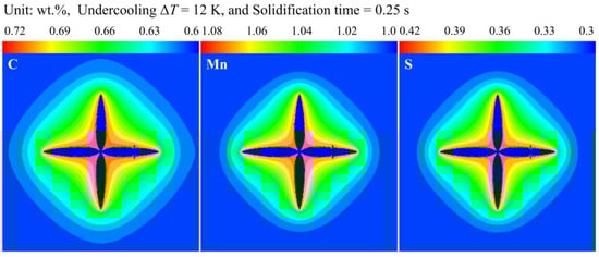 A CA model was applied to undercooled molten steel, with components of Fe-0.6% C-1.0% Mn-0.3% S in an adiabatic domain of 0.3 × 0.3 mm2, in order to compute the matrix growth of equiaxed dendrites with an initial temperature 1800 K. The computational domain was meshed into 300 × 300 grids and a dendrite nucleus was placed in the centers. Computational data used in the present study are listed in Table A1 and Table A2 (Appendix A). Figure 3 showed solutal concentrations of trace elements C, Mn and S, and the morphology of growing dendrites. The diffusivities of the solute elements conformed to the relationship DC* > DS* > DMn*, resulting in a rapid rejection of element C from dendrites into the liquid phase and the formation of a large diffusion zone. The zone areas of elements S and Mn declined in turn. Solute segregation led to an enrichment of elements at the frontier of dendrites, thus forming a radical concentration gradient centered on the dendrite nucleus due to concentration being superior to the liquid phase. The tips of the dendrites grew preferentially compared to their arms because of the axial and radial diffusion of solute elements, rather than only the radial for the arm, causing a simultaneous enhancement in concentration gradient and growth velocity. Solutal diffusion at the roots of the dendrites was hindered by the surrounding arms so that the radial coarsening growth was slowed and caused root necking and solute enrichment.