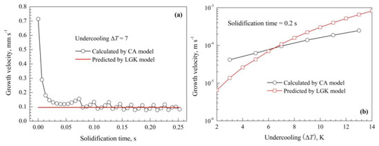 Comparison of growth velocity predicted by the CA and LGK (Lipton-Glicksman-Kurz) models with velocity units of (a) mm·s−1 and (b) m·s−1.