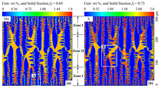 Solidification morphology expressed by solutal concentration of elements (a) Mn and (b) S.