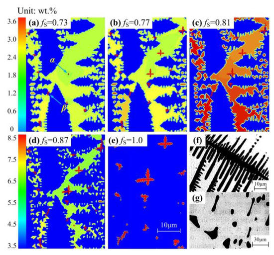 Solutal transport was active in Zone II and almost no liquid holes formed because the large space between the columnar dendrites caused second dendrites to no longer play an important role in the liquid phase transfer. Here, precipitated MnS usually existed in three shapes. For example, the seeds α and β of MnS in Part B at solid fraction fS = 0.73 were immersed freely in the liquid phase or attached to a solidified matrix containing columnar and secondary arms, respectively, as shown in Figure 7a. Seed α was fully in contact with the liquid phase and was likely to be fostered into an isotropic two-dimensional dendrite shape. Its arms that were close to the matrix grew slowly due to local insufficiency of solutes. However, MnS grown from seed β was restricted by the surrounding matrix and could only develop into an irregular strip- and cluster-shape. The three MnS shapes are shown in Figure 7b at solid fraction fS = 0.77, and they continued to grow, as shown in Figure 7c,d, until they turned into solids (Figure 7e). Predicted dendrite-, strip- and cluster-shaped MnS were compared with those of captured microscopic images [32] (Figure 7f,g). Simulated and observed results agree well with shape and size. Our work confirmed that MnS (three shapes) had a high possibility of coexistence, and also explained why this occurs.
