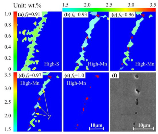 Because of this, it was necessary that the Gibbs free energy be reduced and the nucleation rate of MnS was enhanced in the High-S system, making the solid fraction of MnS, when it was beginning to be precipitated, slightly lower than that of the High-Mn system. Moreover, the content of Mn was a restrictive factor in deciding the amount of precipitated MnS because it was a supplement to the rejected S during MnS growth, attributed to its high partition coefficient. We counted the precipitated MnS of all PCs in the computational domain and determined that the volume ration of MnS for the two systems were 9.73 × 10−6 and 3.76 × 10−5, respectively, showing a relationship of 4 times that was coincident with the initial concentration of Mn. It is noteworthy that a re-precipitation of MnS was observed during solidification in the High-Mn system. Precipitated MnS was immobilized by the solidified matrix and the residual liquid phase was also partitioned into small pools, as shown in Figure 8c. Excessive Mn had great potential to react with residual S, which was able to form a new seed γ in these pools when the required reaction conditions for MnS formation could be satisfied again, as shown in Figure 8d. However, re-precipitation of MnS was observed in the High-S system because rejected Mn was rapidly consumed by the high content of S, and it was difficult to reach a sufficient concentration to reduce the Gibbs free energy in the pools. We confirmed that it was likely to have a re-precipitation of MnS for solidification of Fe-C-Mn-S steel with a high content of Mn and low content of S. The predicted morphology of MnS was compared with those of in-cast billet samples that were observed using a scanning electron micrograph and energy dispersive spectrometer [13] (Figure 8e,f). They were in good agreement in terms of shape and size, as well as site. Our model was able to simulate the precipitation and re-precipitation of MnS simultaneously. This was difficult to conduct through experimentation.