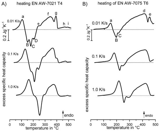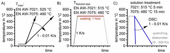 The age hardening treatment comprises three major steps: solution annealing, quenching, and aging. The solution annealing and the involved heating operation towards the soaking temperature are required to establish the basis for the age hardening by generating a complete solid solution. Therefore, the first task is to define appropriate solution treatment temperatures. Therefore, DSC heating curves of various heating rates can give information about when the dissolution is potentially completed during heating to a certain temperature by a certain heating rate. DSC heating experiments as function of temperature on EN AW-7021 T4 with different heating rates are shown in Figure 2A).