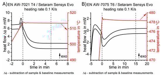 DSC heating experiments on (A) 7021 T4 and (B) 7075 T6.