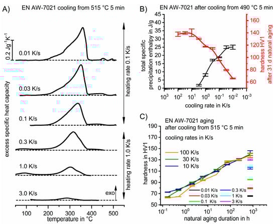 (A) Cooling DSC curves of EN AW-7021 for various cooling rates; (B) Total specific precipitation enthalpy and hardness after cooling and natural aging as functions of cooling rate; (C) Natural aging behavior of EN AW-7021 for various cooling rates.