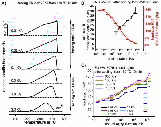 (A) Cooling DSC curves of EN AW-7075 for various cooling rates; (B) Total specific precipitation enthalpy and hardness after cooling and natural aging as functions of cooling rate; (C) Natural aging behavior of EN AW-7075 for various cooling rates.