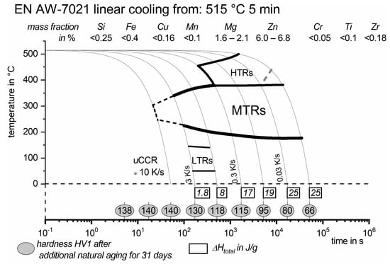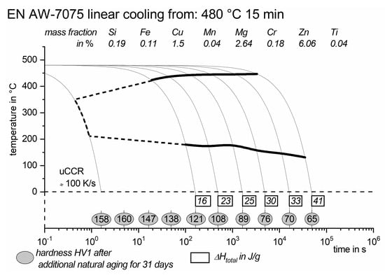 Based on the results discussed above the continuous cooling precipitation diagrams (CCP diagrams) of the two alloys EN AW-7021 and -7075 are derived and plotted in Figure 6 and Figure 7, respectively. CCP diagrams describe the precipitation behavior of aluminum alloys during continuous cooling from solution annealing as a function of temperature and time in a condensed form (Ref. []). A very broad time (cooling-rate) range is physically and technologically relevant and thus necessitates the time axis to be scaled logarithmically. The time axis ranges from 0.1 to 1 × 16 s, while the plotted temperature range is fixed on 550 to 0 °C. Some selected cooling curves of constant cooling rates are provided to indicate the time-temperature development of the linear cooling processes. Continuous cooling precipitation diagrams are only valid for the given alloy composition investigated and the specific solution treatment applied. Be aware, that CCP diagrams must be read following continuous cooling, they are not valid for isothermal conditions. Precipitation start and finish temperatures that depend on quench rate are shown in bold lines. In almost any case, several precipitation reactions during cooling occur sequentially or overlapping. Precipitation start of the first reaction and precipitation finish of the last reaction could be determined exactly and are shown in continuous black lines. Overlapping reactions are hard to separate by DSC [,]. Therefore, intermediate precipitation start and finish temperatures have been estimated using the procedure outlined in []. Sometimes, precipitation start and finish temperatures have been extrapolated for readability by dashed black lines. To provide information about precipitation intensity, the total precipitation enthalpy ΔHtotal was recorded; its values are plotted below certain cooling paths in rectangles. The total precipitation enthalpy is proportional to the volume fraction of precipitates formed during cooling. In addition, the Vickers hardness HV1 after cooling and additional aging is provided in ovals. Precipitation enthalpy is high for slow cooling, whereas hardness after aging is high for rapid quenching. Substantial precipitation of quench induced precipitates during cooling causes a loss of alloying elements in supersaturation available for subsequent aging. For both enthalpy and hardness values, thin vertical lines indicate the exact time of validity. The slowest cooling rate at which a certain precipitation reaction is suppressed completely during cooling is defined as the upper critical cooling rate (UCCR) []. These values are provided in the lower-left corner of the diagrams. In cases where (in situ) DSC measurements were not possible up to the cooling rates above the UCCR, the latter is estimated based on the hardness results (Figure 4B and Figure 5B).
