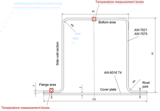 Hot forming has been tested on a hat-type profile (Figure 8). The 2 mm thick sheets of 7021 respectively 7075 were heated to their above-mentioned solution heat treatment conditions and subsequently either quenched in a water bath or in the cold dies during hot forming. The temperature used during cold die quenching was recorded by placing type K thermocouples into two small bores that have been drilled into the blanks. The position of the bores was chosen to be in the center of bottom and flange area of the hat-type profile respectively. Three measurements were carried out for each alloy to ensure reproducibility.