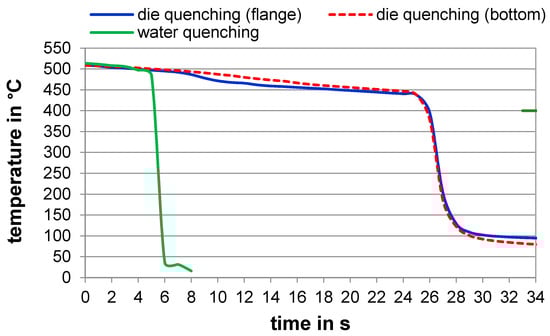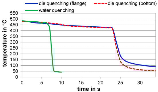 Figure 10 shows the cooling curves recorded for water and cold die quenching of 7075. The sheets cool from 480 °C down to about 425 °C during this time span, resulting in a cooling rate of about 2–3 K/s. Compared to Figure 5A, this temperature loss seems to be tolerable, but at the limit, because the major quench induced precipitation reactions during cooling of 7075 start just below 425 °C. A critical temperature interval for precipitation during cooling of 7075 can be estimated from 425 °C to 180 °C. In this temperature interval, die quenching resulted in cooling rates of about 120 K/s, which is exactly in the critical cooling rate range of 100 K/s for 7075. Quenching rates at the bottom area are slightly higher than at the flange area. This is due to the longer contact of the bottom area with the tool, which starts already during positioning. To summarize, the die quenching of 2 mm 7075 thick sheets can be realized but is very close to the critical process parameters.