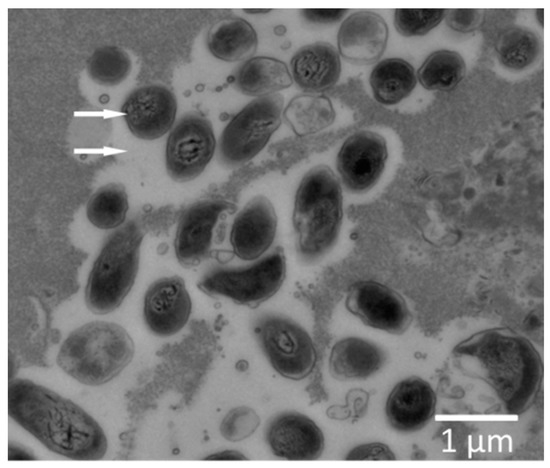 Bacterial biofilm in tissue pockets at a distance from the implant surface. Magnesium discs subcutaneously implanted into standard BALB/c mice were immediately infected with Pseudomonas aeruginosa. After one week, tissue adjacent to the implants was subjected to scanning transmission electron microscopic analysis (for a more detailed description see Reference [113]). Bacteria (upper arrow) surrounded by clear areas (lower arrow), indicating the presence of exopolysaccharide matrix material, a typical biofilm component. Reproduced with permission from J. Biomed. Mater. Res.; Published by Wiley 2016.