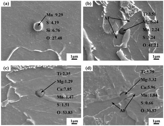- Chai, F.; Yang, C.F.; Su, H.; Zhang, Y.Q.; Xu, Z. Effect of magnesium on inclusion formation in Ti-killed steel and microstructural evolution in welding induced coarse-grain heat affected zone. J. Iron Steel Res. Int. 2009, 16, 69–74. [Google Scholar] [CrossRef]
