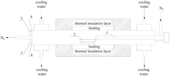 Experimental setup for the thermal treatment (1—Thermocouple; 2—Corundum boat containing sample; 3—Removable lid; 4—Condensed volatile product).