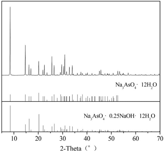 The sodium arsenate used in this study was collected from Hunan Province, China. It was produced while separating arsenic from antimony in the AAR by water leaching. During the process, soluble arsenic species were dissolved into the aqueous phase, which was then boiled to obtain sodium arsenate. The sample was subjected to X-ray Fluorescence (XRF) (Bruker, Karlsruhe, Germany) to analyze its general elements and accurate analyses were conducted for the contents of arsenic and sodium. The results are shown in Table 1, indicating the crystals mainly consist of arsenic and sodium with minor impurities, such as Fe, Sb, S, and so on.
