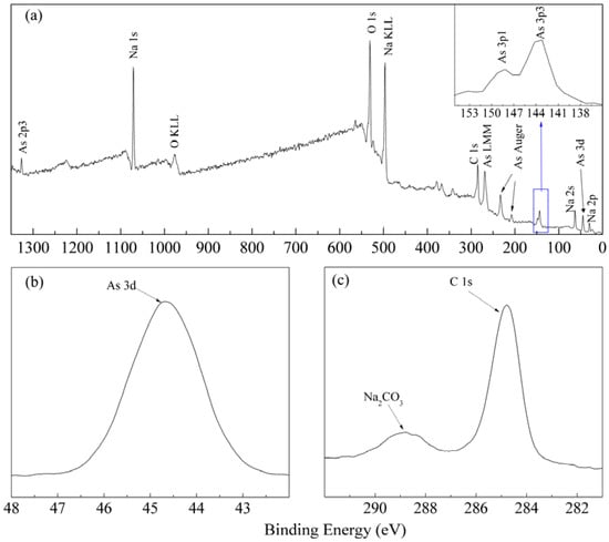 The XPS wide scan spectrum is presented in Figure 3a, and peaks attributed to arsenic can be clearly seen including As 2p3, As 3p3, As 3p1, and As 3d at 1326 eV, 143 eV, 148 eV, and 45 eV, respectively [,]. In addition, peaks at 268, 232, 208 eV could be assigned to As Auger lines []. Significant peaks corresponding to O 1s, C 1s, and Na 1s are also observed. Other elements which were found by XRF could not be detected by XPS due likely to their low contents. As reported [,,], the binding energy of As 3d has actually been indicative of the oxidation states of arsenic, with a value of 44 eV and 45 eV for As(III) and As(V), respectively. Figure 3b has shown the high-resolution scan of As 3d, which gives a binding energy of 44.7 eV. The peak shape suggests the presence of a single valence, and not a contribution of multiple valences [], which means As (V) is the only phase in the sample. On the other hand, detailed spectrum of C 1s is shown in Figure 3c. It can be noted that besides the main peak of C 1s located at 284.8 eV, a small peak is also observable at 289 eV. This could be assigned to sodium carbonate [], although XRD has failed to reveal the presence of sodium carbonate.
