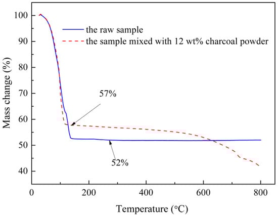 For the sample without charcoal powder, a sharp mass reduction was observed at temperatures ranging from 30 °C to 135 °C, which, in consistence with results indicated by Zhao et al. [], could be explained by the evaporation of crystal water: