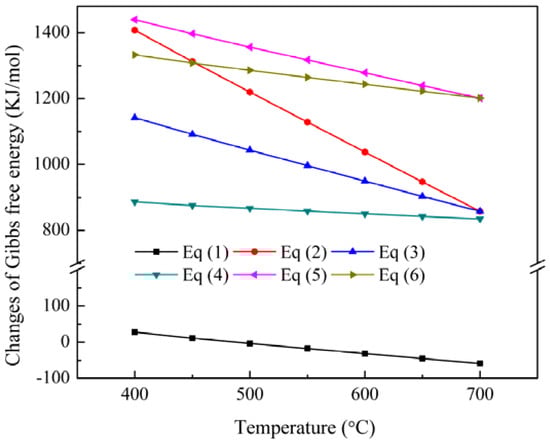 Based on TG results, thermochemical calculation was then carried out to reveal reactions causing the mass loss, and most importantly, to evaluate the possibility of direct conversion of sodium arsenate into free element arsenic. Using Outotec’s Chemical Reaction and Equilibrium Software HSC Chemistry (Version 6.0, Espoo, Finland), changes of standard Gibbs free energy (T, 1 bar) of concerned reactions during the roasting process were calculated.