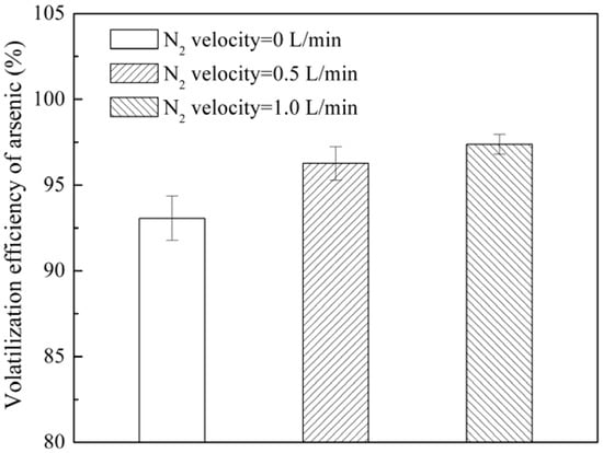 As seen in Figure 6, without N2, the arsenic removal efficiency had already reached 93.07%. When the gas was introduced into the system and the flow rate was set at 0.5 L/min, about 96.26% of arsenic could be removed. However, further increasing the N2 to 1.0 L/min promoted arsenic volatilization only to 97.38%. Taking into account the standard deviations, the improvement of arsenic extraction by increasing the N2 flow rate from 0.5 L/min to 1.0 L/min is negligible and the results should be considered to be at the same level. Therefore, in the following experiments, the N2 flow rate was fixed at 0.5 L/min.
