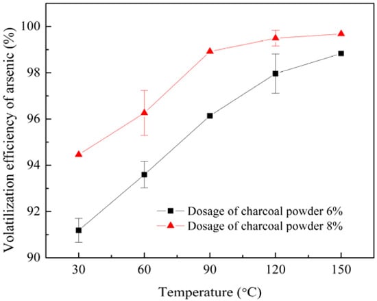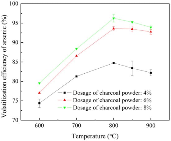 Effects of charcoal powder dosage on arsenic volatilization under different temperatures (roasting time: 60 min).