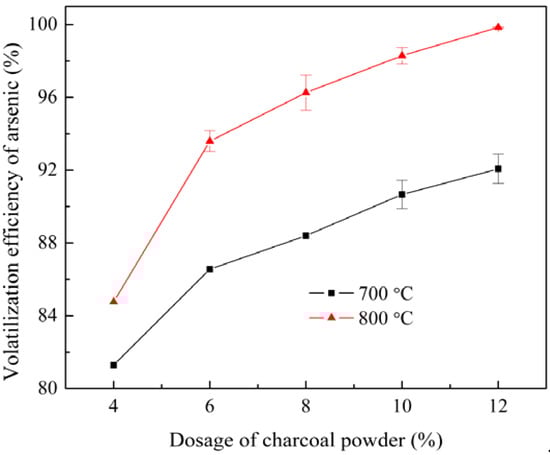 In order to further improve the arsenic extraction, effects of the dosage of charcoal powder under different temperatures were investigated. As shown in Figure 8, arsenic removal had apparently depended on the amounts of the reductant added into the system. More charcoal powder was beneficial for extracting arsenic from the sample. The arsenic removal had almost reached 100% (exactly, 99.84%) with 12% addition of the charcoal powder by roasting the sample at 800 °C for 60 min. At this point, it should be reported that arsenic content in the roasting product had correspondingly decreased to 0.0598%. In comparison, only 92.07% of arsenic was extracted at 700 °C and the arsenic grade in the residue was 3.24% after roasting for 60 min with 12% charcoal powder.