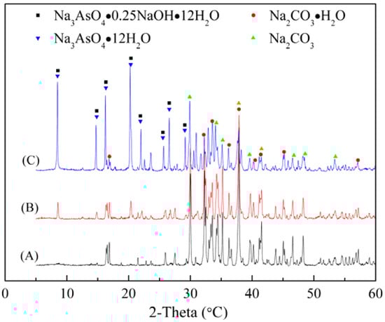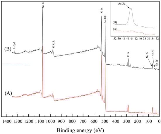 Figure 10 shows the results of XRD for the roasting residues. First of all, the presence of Na2CO3 and/or Na2CO3·H2O in all the samples was confirmed. However, there is no evidence for the generation of Na2O or NaOH. Secondly, arsenic salts including Na3AsO4·12H2O and Na3AsO4·0.25NaOH·12H2O are found in samples B and C. Since previous results has suggested that arsenic extractions were 96.26% and 77.04% for samples B and C, respectively, it is unsurprising to make this observation. Meanwhile, the hydration of these phases is also accountable because, as mentioned before, the sample had been deliquesced. Finally, there were no arsenic phases detected in sample A. Given the fact that only 0.0598% of arsenic is left in the residue, it is reasonable that the trace phase is difficult to detect. This could again be proved by XPS results, as shown in Figure 11, where it was found that the characteristic peaks of arsenic disappeared in sample A while they were still detectable in sample B. The narrow scan of As 3d further confirmed this observation.