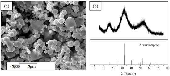 The collected volatile product, which turned out to be black powder, was assayed by ICP, indicating its arsenic content had reached 97.3%. The SEM image revealed the presence of countless spherical granules and of a few crystal-like particles in the product (Figure 12a). The sizes of these particles are small (less than 5 μm) and the irregular ones tended to be agglomerated with each other. Further in Figure 12b, the XRD pattern shows multiple broad peaks, suggesting these particles are amorphous. However, some of the characteristic peaks of arsenolamprite (PDF#85–1712, chemical formula: As) do fit into the ranges of the broad peaks although it is impossible to identify their d values. This may suggest that related crystal faces on these directions were poorly formed. It is explainable since when the temperature is rapidly decreased for the desublimation of the gaseous phase, it usually leaves no time for thorough crystallization.