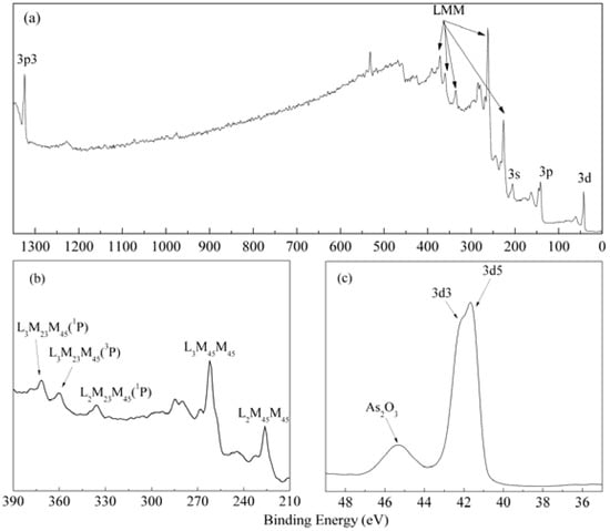 Figure 13 shows the XPS spectra of the volatile product. As shown in Figure 13a, besides peaks for arsenic, carbon, and oxygen, there are no other lines found. In addition, As Auger lines at 226, 262, 336, 360, and 371 eV are clearly demonstrated (Figure 13b). The most sound evidence for the formation of metal arsenic can be found in Figure 13c, where high-resolution of the peak As 3d is presented. It perfectly matched the reported binding energies of 41.6 and 42.3 eV for As 3d5 and As 3d3, respectively []. On the other hand, a small peak is found at 45.2 eV and is attributed to As2O3 [], which must be formed due to surface oxidation of the particles.