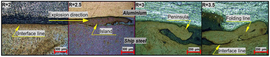 - Hoseini Athar, M.M.; Tolaminejad, B. Weldability window and the effect of interface morphology on the properties of Al/Cu/Al laminated composites fabricated by explosive welding. Mater. Des. 2015, 86, 516–525. [Google Scholar] [CrossRef]