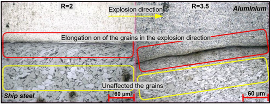 - In the ship steel-aluminum bimetal composite samples, waving in the interface increased at increasing explosive ratios and in parallel with this, the wavelength and amplitude increased. In addition, the grains close to the bonding interface extended parallel to the explosion direction as a result of the sudden cold plastic deformation that occurred due to the pressure applied during the explosive welding. This effect gradually disappeared at distances moving further away from the interface.