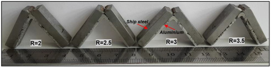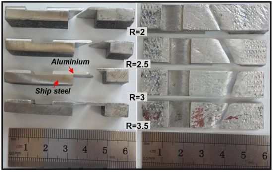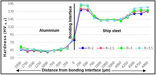 - The hardness test showed that the highest hardness value was measured at the bonding interface, followed by the outer surface of the plates (ship steel and aluminum) and the thick central areas of the plates. Moreover, the hardness values that were measured for the bimetal composite samples increased at increasing explosive ratios.