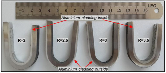 - Guo, X.; Wang, H.; Liu, Z.; Wang, L.; Ma, F.; Tao, F. Interface and performance of clam steel/aluminum clad tube prepared by explosive bonding method. Int. J. Adv. Manuf. Technol. 2016, 82, 543–548. [Google Scholar] [CrossRef]