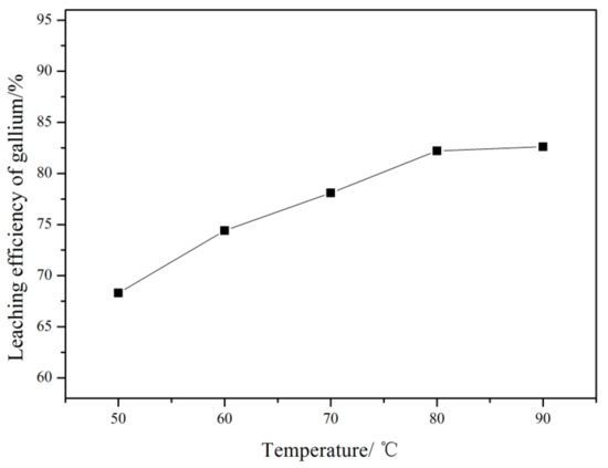 In this set of tests, leaching temperature was varied in the range between 50 and 90 °C, and the mass ratio of alkali to ore was fixed at 1.2:1. Other test parameters were set the same as in Section 3.2.1. As shown in Figure 5, the leaching efficiency of gallium shows an upward trend as the temperature raised. At a temperature of 80 °C, 82.2% of the gallium in flue dust could be extracted. The leaching efficiency of gallium was maintained almost constant when the temperature was increased to 90 °C. Therefore, the subsequent leaching tests were performed at 80 °C.