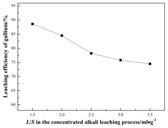 Effect of liquid to solid (L/S) for concentrated alkali leaching on leaching efficiency of gallium.
