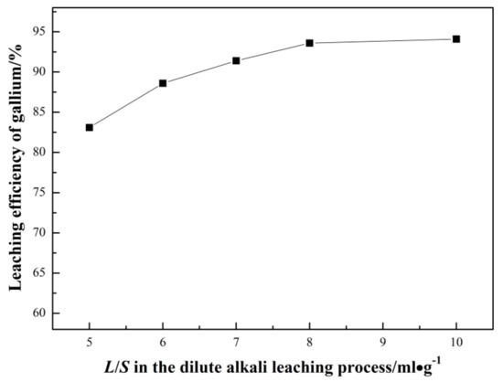 Effect of L/S for dilute alkali leaching on leaching efficiency of gallium.