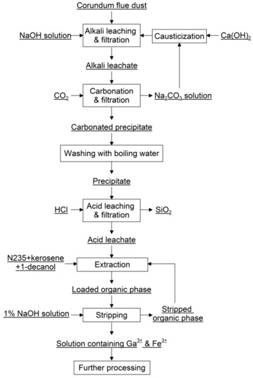 The corundum flue dust used in this study was collected from Shanxi province, China. Chemical composition of this corundum flue dust was shown in Table 1. All chemical reagents were used as received without further purification. Sodium hydroxide, hydrochloric acid used for leaching, and kerosene, 1-decanol used for solvent extraction were of analytical grade. N235 (with carbon chains C8 35–45% and C10 52–63%, Shanghai Rare-Earth Chemical Co. Ltd., Shanghai, China) used for solvent extraction was of technical grade.