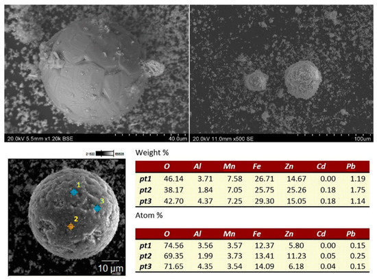 The steelmaking dust used in the study was obtained from a Polish steel plant. All the experiments were carried out on dust in the form of finely divided fractions (less than 100 μm) with a moisture content of 5% (estimated from a 24 h drying test at 105 °C). The chemical and mineralogical compositions of the dust were determined by Microwave Plasma Atomic Emission Spectroscopy (MP-AES) (MP-AES 4200, Agilent, Penang, Malaysia), and Scanning Electron Microscopy (SEM) (Hitachi, Tokyo, Japan) and X-ray diffraction (XRD) (MiniFlex II, Rigaku, Tokyo, Japan), respectively. The composition and morphology of the dust strongly depends on the quality of the scrap and on the mode of operation of the electric furnace [3]. Typical EAF dust particles obtained by scanning electron microscopy with analysis of a selected particle, are presented in Figure 2.