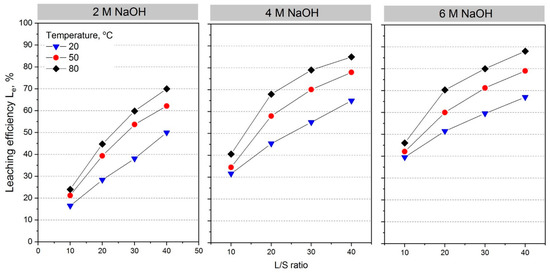 Leaching efficiency for zinc as a function of L/S ratio for different NaOH concentrations and temperature.