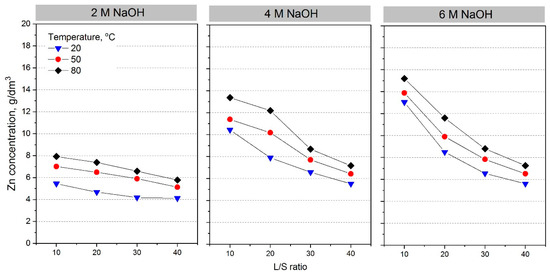 Zinc concentration as a function of L/S ratio for different NaOH concentrations and temperature.