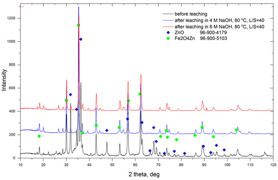 The results obtained show that zinc leaching efficiency depends on all the examined factors, i.e., time, temperature, NaOH concentration and the solid phase content in the leaching solution. At each temperature, the increase in concentration from 2 M to 4 M NaOH increased zinc extraction by a dozen percentage points (13.3–23.4). For further increase in NaOH concentration, the efficiency gains were much lower (0.9–7.9 pp). This may be due to either higher viscosity of the solution and the resultant difficulty in transporting the reactants to and from the reaction surface, or from achieving the maximum extraction under the conditions employed. Additionally, the smallest effect of temperature was observed in solutions with a high solid phase content (L/S = 10). In this case, raising the temperature by 30 °C increased the efficiency of the zinc leaching process by a maximum of 6 pp. In each subsequent leaching test, in which the liquid phase content was increased with respect to the solid phase, the effect of temperature was stronger, and the maximum increase in leaching efficiency was about 15.6 pp for L/S = 30 and 2 M NaOH. Although increasing the liquid phase content in the leached slurry had a beneficial effect on the dust leaching efficiency in terms of metal extraction into the solution in general, the concentration of zinc in the solution actually decreased with increased L/S. The increase of L/S from 10 to 40 in the case of leaching in 2 M NaOH at 80 °C resulted in the drop of zinc concentration from 7.93 g/dm3 to 5.78 g/dm3, i.e., about 27%. At the highest NaOH concentration of 6 M, the decrease in zinc concentration associated with dilution of the solution was 52% (from 15.19 to 7.26 g/dm3). Erdem et al. [16] observed that waste materials containing zinc in the form of ZnFe2O4 were difficult to leach because franklinite is very stable and poorly soluble in most types of alkaline solutions. They achieved a maximum leachability of 21.47% during leaching at 25 °C for 120 min, using a stirring speed of 300 rpm, L/S = 5 and NaOH concentration of 15%. In the present study, it was found that high solid phase content results in low leaching efficiency of Zn, therefore the results obtained by Erdem et al. [16] appear to be lower than those which can be achieved. The maximum zinc extraction (88.0%) in this study was obtained for 6 M NaOH at 80 °C and L/S = 40. Figure 7 presents a diffractogram of EAF dust samples before and after leaching under selected process conditions.