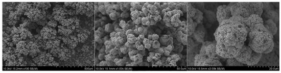 Since the concentration of elements in the electrolyte was low (Table 4), the process of electrolysis was straightforward. The result was a spongy powder, having a morphology as shown in Figure 9.