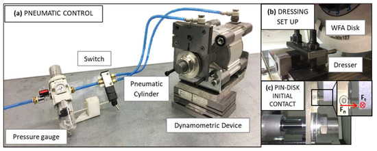 (a) Set up of pneumatic control of pin-on-disk, (b) dressing set up of vertical surface of the wheel and (c) initial contact between pin and disk on the vertical and conditioned wheel surface.