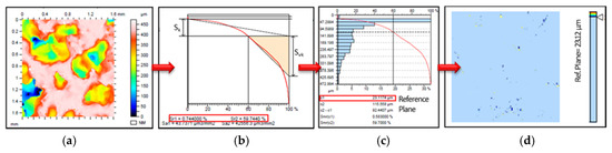 Steps to achieve the reference plane of each conditioned wheel surface. (a) Surface topography, (b) Abbot-Firestone curve and its corresponding functional parameters, (c) Abbot-Firestone curve and material distribution and (d) reference plane showing sliced material.