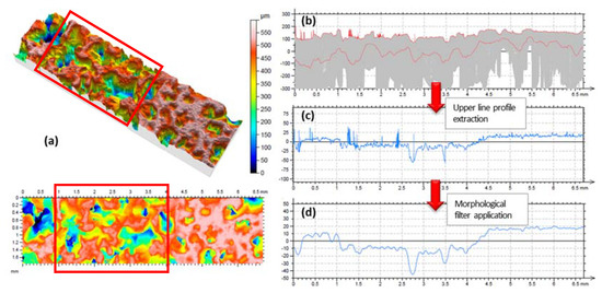 Wear depth quantification. (a) Surface digitalization, (b) Profiles superimposition, (c) Upper line extraction and (d) envelope line after morphological filter application.