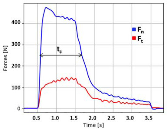 Pin-on-disk tests were conducted, varying the sliding speed and pneumatic pressure of the cylinder. Both normal and tangential forces (Figure 1) are higher to lower sliding speed. For WFA tests and a sliding speed of 20 m/s, the mean value of Fn is 514 N. However, for 30 m/s, a value of 455 N was reached. In contrast, the tendency of forces with pneumatic pressure variation is not shown, and normal force values vary from 490 N to 510 N. This is due to the materials in contact and the heavy conditions of the tests. In Figure 4, the normal and tangential force of Test 1a is plotted, whilst the alumina steel contact time is also shown. The apparent small pin contact area together with high sliding speed promotes high temperatures on contact, softening hardened steel and increasing abrasive grain wear. Therefore, the contact time is very short—approximately 1.15 s—which impedes the ability to reach theoretical force. That being the case, the studied cases do not present significant variations with pneumatic pressure. Similarly, the wear that occurs in 1.15 s is too high compared with the wear suffered during a real grinding process.