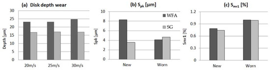 To identify each type of abrasive grain wear in tribological wear tests, a reduced peak height functional parameter and peak material proportion parameter are used. The values of these parameters are represented in Figure 5b,c. With regard to WFA, if just dressed and worn states are compared, higher values of Spk are achieved for new alumina, and so a rougher or sharp surface is obtained on dressed disk than on a worn part, and the height of the peaks is halved for worn alumina. Furthermore, the material proportion in the peaks increases to 20% for worn alumina. Therefore, wear flat is the wear type that occurs in WFA.