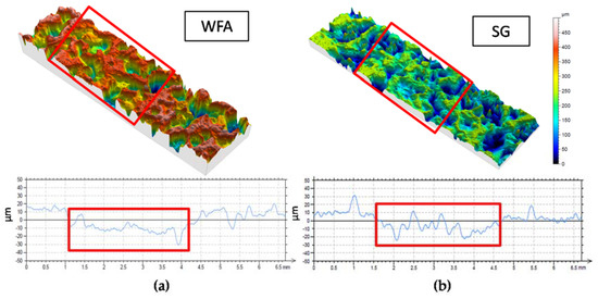 3D wheel surface digitalization and envelope of filtered superimposed profiles for (a) WFA and (b) SG alumina.