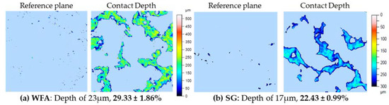 To quantify the real contact area, the groove depth is needed. For each abrasive grain structure, different depths are measured. Thus, the depth at which the real contact area is obtained is different for each disk. As previously explained, a reference plane is defined for each just dressed surface. From the reference plane, slices are made of the topography at wear depth. The apparent pin area is 15 mm2 in the case of WFA Figure 7a, with a real contact area of 29.33 ± 1.86%, 4.4 mm2 and for SG alumina this is 22.43 ± 0.99%, 3.36 mm2 Figure 7b. The real contact area of SG alumina is slightly lower than WFA due to the sharper surface.