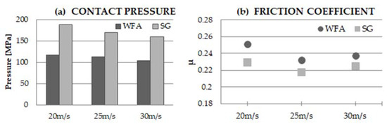 With regard to contact conditions, in Figure 8 both the real contact pressure and friction coefficient is shown. Lower real contact pressures are reached for WFA than for SG alumina—approximately 35% higher for SG alumina. Two effects are responsible for these dissimilarities. On the one hand higher real contact area values are measured on WFA, due to the abrasive grain structure; the dressed SG surface is sharper than that of the WFA. On the other hand, normal forces reached during the tests are approximately 16% lower for WFA than for SG. During the pin-on-disk tests, of the three wear mechanisms that take place during the contact, rubbing and ploughing are the most relevant. However, for SG abrasive grains, the sharper surface implies that the cutting edges are more sharp than on WFA abrasive grains and hence cutting also takes place, but to a lesser extent than on real grinding tests. The flatter alumina surface obtained for WFA show the absence of cutting edges. The rubbing mechanism in WFA is of higher importance, which is confirmed with the Spk parameter comparing the effect of the wear, Spk decrease on worn surface. Therefore, rubbing increases the contact temperature and hence the pin temperature. Hardened steel pin becomes soft and it is worn more quickly than in the case of SG alumina. The reached force is imposed for the pneumatic cylinder and the material softening leads to a lower contact force. Furthermore, high temperatures are reached on the pin material, which explains the high wear values reached on both disks in a very short contact time.
