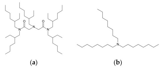 - Narita, H.; Morisaku, K.; Tanaka, M. The first effective extractant for trivalent rhodium in hydrochloric acid solution. Chem. Commun. 2008, 5921–5923. [Google Scholar] [CrossRef] [PubMed]