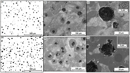 Microstructure of ductile cast iron GJS-600-3U: unmodified (a–c); modified (d–f); as-polished microstructures (a,d); and etched microstructures (b,c,e,f).