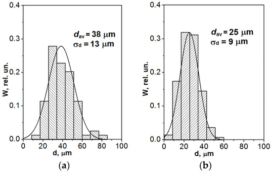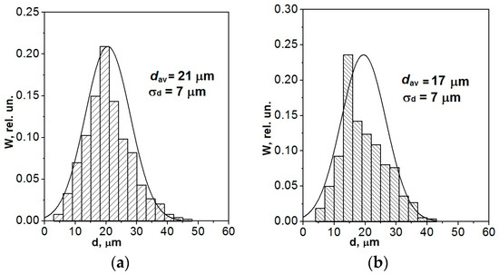 When conducting metallographic analysis of the surface of metallographic sections GJS-600-3U, it was established that after the introduction of MM, the volume concentration and dispersity of graphite rosettes in samples increased (Figure 1a,d). When assessing the number of graphite rosettes per 1 mm2 of the surface of metallographic sections, it was established that for the unmodified ductile cast iron, the density of localization amounted to 98 pcs/mm2, and for modified ductile cast irons it was 150 pcs/mm2. After the introduction of TiO2 + ZrO2 + Na3AlF6, the number of graphite rosettes increased by 1.5-fold. For the assessment of the graphite rosettes diameter in the unmodified and modified ductile cast irons, statistical processing of data of metallographic sections was conducted and histograms of size distribution of graphite rosettes were plotted in Figure 1a,d and Figure 2. As indicated in Figure 2, the distribution of sizes (diameter) of graphite rosettes in the range between ~5 μm and 45 μm typical for ductile cast irons in both states; the standard deviation salso identical and amounted to 7 μm. It has been established that the average diameter of graphite rosettes in the unmodified ductile cast iron was dav = 21 μm, and in the ductile cast iron after the MM introduction, dav = 17 μm, which was substantially lower compared to the unmodified state.