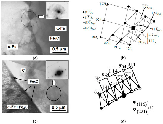 Electron microscope image of dislocation structure of unmodified ductile cast iron, micro-diffraction pattern, taken of precipitated areas: (a) boundary “ferrite-ferrite” and its indicated scheme (b); (c) boundary “perlite-graphite” and its indicated scheme (d).